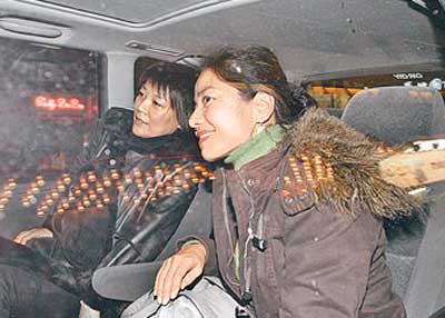 鐘楚紅(右)和金燕玲前晚搭車(chē)離開(kāi)餐廳,透過(guò)車(chē)窗可見(jiàn)她神情愉快。