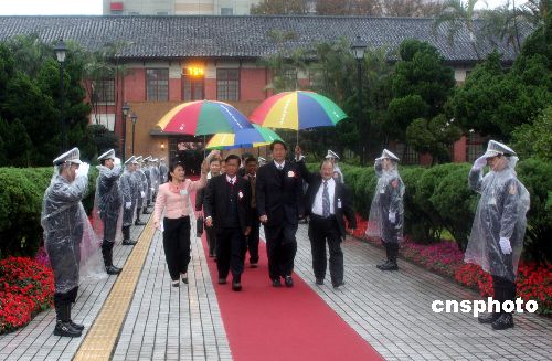 臺灣數(shù)十位腳登高筒皮靴的警官冒雨列隊(duì)在“立法院”內(nèi)紅地毯兩側(cè)迎接臺灣第七屆“立法委員”前來辦理報(bào)到并宣誓就職。
