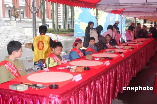圖為最近一年內(nèi)在臺灣書法比賽中獲獎的十位中小學生應邀在開筆大會上揮毫。
