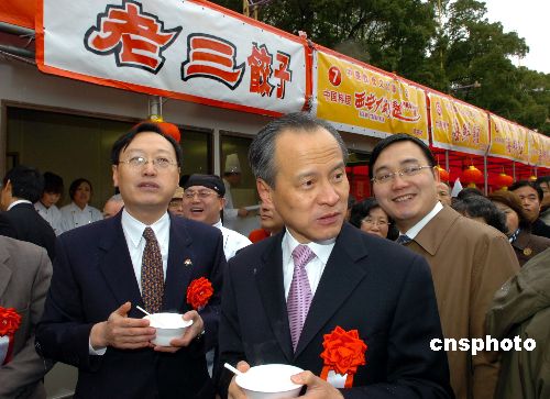 圖為中國駐日大使崔天凱(中)和中國駐名古屋總領(lǐng)事李天然(左)在老三餃子展臺前品嘗中國餃子。