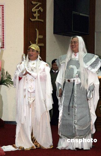 臺(tái)灣第七屆“立法院”十二日舉行新春團(tuán)拜,院長(zhǎng)王金平、副院長(zhǎng)曾永權(quán)分別扮演布袋戲角色。王金平扮演的是“一頁(yè)書(shū)”,這個(gè)角色是象征正道的精神指標(biāo);曾永權(quán)扮演“葉小釵”,象征一個(gè)耿直專(zhuān)一、守信重諾的俠客。中新社發(fā) 徐長(zhǎng)安 攝