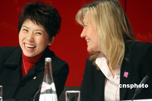 當(dāng)?shù)貢r(shí)間11日下午,北京奧組委奧運(yùn)村部副部長(zhǎng)鄧亞萍(左)和倫敦奧組委的官員、網(wǎng)球運(yùn)動(dòng)員出身的Debbie Jevans(右)在“婦女與奧運(yùn)”論壇上交談。