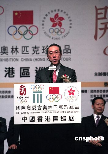 香港特區(qū)政務(wù)司司長(zhǎng)唐英年為奧林匹克珍藏品中國(guó)香港區(qū)巡展致詞。