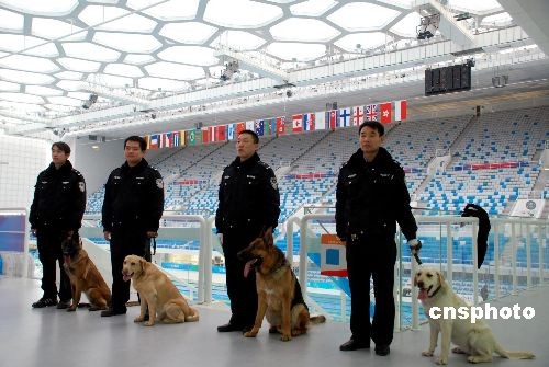 北京朝陽公安警犬隊民警準(zhǔn)備對奧運場館“水立方”實施無遺漏防爆安全檢查。