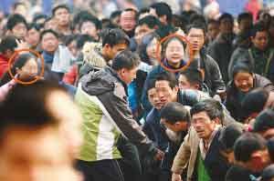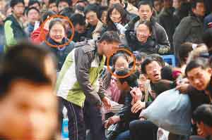 在當(dāng)天10余列隊(duì)伍中,每列都有這樣的票販子,而且無(wú)一例外地插到了隊(duì)伍的最前面。買(mǎi)到車(chē)票的票販子們要么將票交給各自的“帶頭大哥”,要么直接走到候票旅客群中,口中嘀咕著“到哪里?到哪里?”尋找著“獵物”。