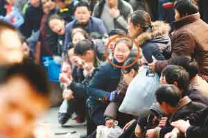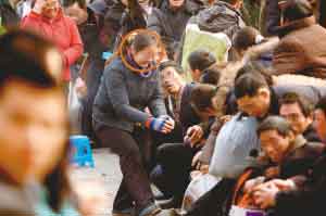 回到隊(duì)伍末端,瘦小男子只得重新排隊(duì)。他一臉無(wú)辜的自稱(chēng)涪陵區(qū)人,名叫孫文件,在天津打工,從13日便開(kāi)始候票。孫先生告訴記者,排在隊(duì)伍前面的一半左右的人都是票販子。他說(shuō),之所以這么肯定這些插隊(duì)的人是票販子,是因?yàn)樗J(rèn)得其中一個(gè),那個(gè)人13日下午向他兜售過(guò)到北京的硬坐車(chē)票,加價(jià)250元,他沒(méi)敢要。