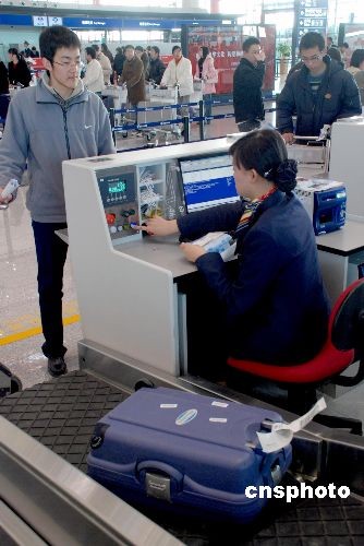 圖為機場工作人員正在為“旅客”辦理托運服務(wù)。