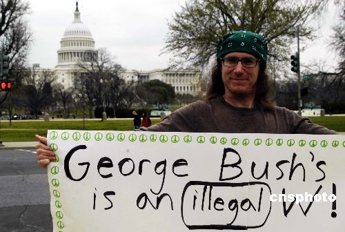圖為一位示威者舉著的牌子上寫著“布什政府在伊拉克的戰(zhàn)爭(zhēng)是非法的,不道德的”。