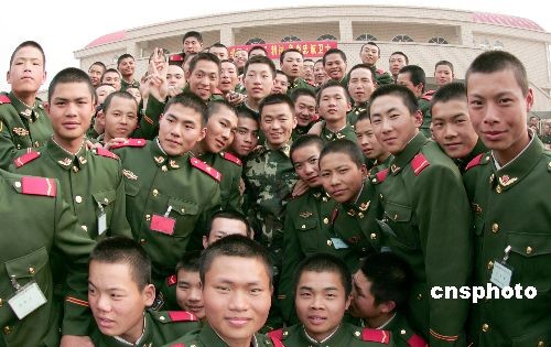 3月21日,《士兵突擊》中扮演許三多的新星王寶強(qiáng),應(yīng)邀來到武警河北總隊(duì)邢臺市支隊(duì)新訓(xùn)大隊(duì),與新兵面對面交談,共話軍旅人生。中新社發(fā) 余洪恩 攝
