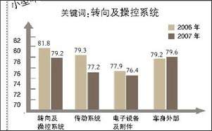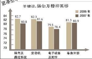 在對(duì)去年初始質(zhì)量滿(mǎn)意度的測(cè)評(píng)指標(biāo)中,緊湊型轎車(chē)“發(fā)動(dòng)機(jī)”環(huán)節(jié)滿(mǎn)意度得分最高,“電子設(shè)備及附件”環(huán)節(jié)滿(mǎn)意度得分最低。初始質(zhì)量各環(huán)節(jié)滿(mǎn)意度均低于2006年得分,“轉(zhuǎn)向及操控系統(tǒng)”滿(mǎn)意度降幅最大。