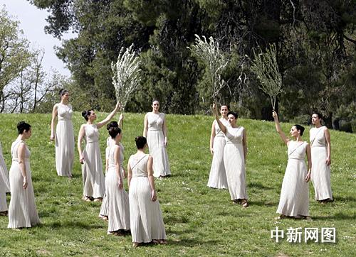 希臘當(dāng)?shù)貢r(shí)間3月24日,北京二00八年奧運(yùn)會(huì)圣火采集儀式在古奧林匹亞競技場舉行,最高女祭司順利采集到火種。女祭司手擎橄欖枝不斷變幻隊(duì)形,在山坡上舞蹈。中新社記者 王歡
