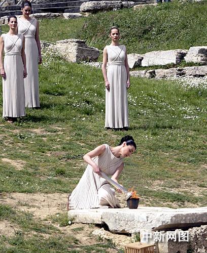 希臘當(dāng)?shù)貢r(shí)間3月24日,北京二00八年奧運(yùn)會(huì)圣火采集儀式在古奧林匹亞競技場舉行,最高女祭司用順利采集到火種引燃手中的火炬。中新社記者 王歡