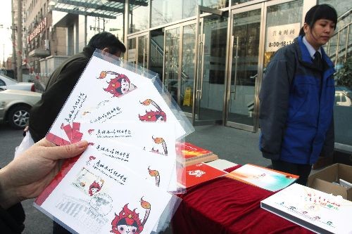 3月24日,北京百萬莊郵局工作人員正在發(fā)售《第29屆奧林匹克運(yùn)動(dòng)會(huì)--火炬接力》紀(jì)念郵品。當(dāng)日,2008年首套奧運(yùn)郵票《第29屆奧林匹克運(yùn)動(dòng)會(huì)--火炬接力》正式發(fā)行。中新社發(fā) 追影 攝