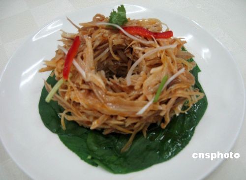 為迎接北京奧運場館國家體育場“鳥巢”即將落成,北京全聚德亞運村店根據(jù)鳥巢的特殊造型,以鴨膀絲為主要原料進(jìn)行加工及設(shè)計,推出“鳥巢膀絲”奧運菜品。中新社發(fā) 杜燕 攝