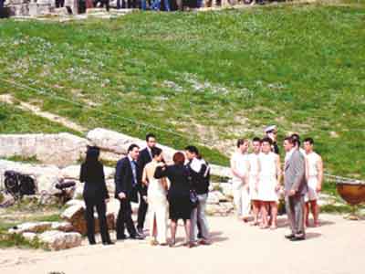 最激動人心的時刻即將來臨,最高女祭司娜芙普利都將在赫拉神廟的凹面鏡前點燃奧運圣火。從古競技場到圣火采集地的赫拉神廟的路上,中間有一個通道,“禁地”前可謂戒備森嚴,只有少數(shù)VIP貴賓才能進入。這時,章子怡也想起身近距離觀看點火儀式,但在通道前被安保人員攔住。他們顯然沒弄清楚這位美女的身份,很疑惑地看著章子怡,身邊的2008北京奧運官方電影工作人員則趕忙解釋:“super star”(超級巨星)。但胸前只是掛著記者證,并非VIP證的章子怡,盡管舉著證交涉了半天,還是被攔在了赫拉神廟之外。