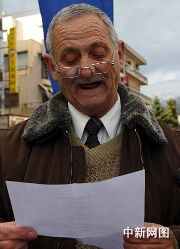 3月25日,北京2008年奧運(yùn)圣火希臘傳遞第二天,慶典儀式在終點(diǎn)約阿尼納舉行。一位當(dāng)?shù)乩险咴诶收b自己新近創(chuàng)作的贊美奧運(yùn)圣火的詩(shī)歌。 中新社記者 王歡