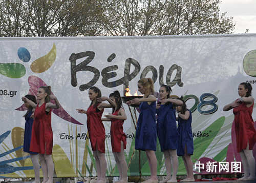 3月26日,北京奧運(yùn)會圣火希臘境內(nèi)傳遞第三日,抵達(dá)當(dāng)天最后一個城市韋里亞。慶典儀式上,演員身穿代表奧運(yùn)五環(huán)顏色的衣服翩翩起舞。中新社記者 王歡