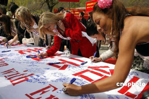 圖:國(guó)際旅游小姐簽名祝福北京奧運(yùn)