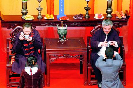 我覺得一個團隊要有點規(guī)矩,師徒之間要有一種傳統(tǒng)。我是一個民間藝人,我經營二人轉從沒有到有,從不景氣到想看買不到票,這個過程給我?guī)砗艽蟮氖斋@。那些學生,之前我都已經一批一批收完了,我想在那天給他們一個證書、給他們一個忠告,讓他們知道趙門的規(guī)矩,怎么做人。那天收了35個,只有四五個是新收的學生,只是有一個排序,我給他們發(fā)了一個聘書,發(fā)了一個我給他們寫的字畫。