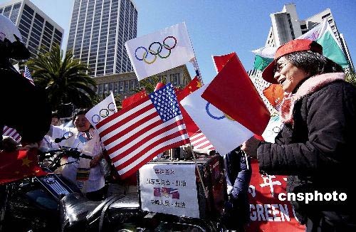 北京奧運火炬在美國舊金山傳遞,當(dāng)?shù)厝A人華僑傾力出動為北京奧運圣火傳遞活動加油。 陳鋼 攝