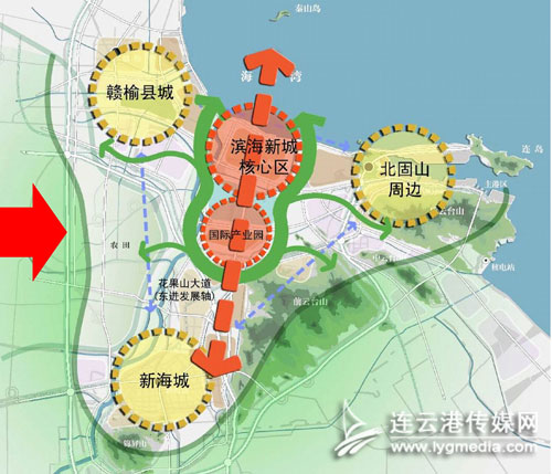 一心三極的內(nèi)涵是,以連云港新海城區(qū)、東部城區(qū)、贛榆城區(qū)形成相互聯(lián)動的三大增長極,而位于三極之間的海濱新區(qū)是未來最為重要的城市核心。
