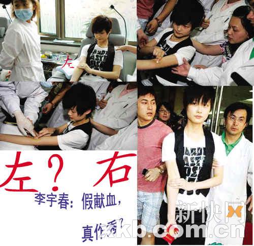但是李宇春此次義舉卻被網(wǎng)友質(zhì)疑是一場做秀,有網(wǎng)友在論壇貼出圖片,“揭發(fā)”李宇春獻血的手忽左忽右。昨日記者致電天娛負責(zé)藝人管理的胡小姐,對方對做秀傳言表現(xiàn)得很氣憤,說:“現(xiàn)在這個時候,如果這種事都還造假,那就根本不配做藝人,甚至不配做人!