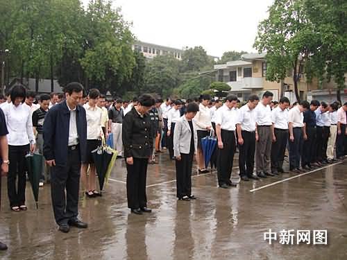 五月十九日十四時二十八分,近千名福建漳州市黨政機關干部冒著綿綿細雨,在政府大院的國旗下默哀,深切哀悼四川汶川大地震遇難同胞。正在當地考察的全國人大常委會副委員長陳至立(前排左二),和福建省政府、人大官員一起參加默哀。呂峰鵬 攝