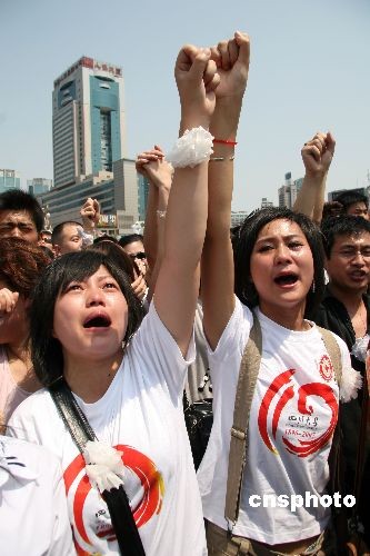 5月19日14時(shí)28分,成都天府廣場,數(shù)以萬計(jì)的民眾自發(fā)聚集在一起默哀,為在四川汶川地震中遇難的同胞哀悼、祈禱,之后,萬人高喊“雄起”!