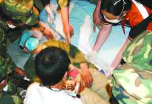 昨日,在安縣中學(xué)第二軍醫(yī)大學(xué)的醫(yī)療站里,七天不見天日的彭國華被蒙著雙眼,整張臉已徹底塌陷,半截牙簽長的胡子已經(jīng)和頭發(fā)連成一片。36歲的文友會一直守在丈夫跟前,守望著這張熟悉而陌生的臉。七天來,她從未放棄救出丈夫的信念。