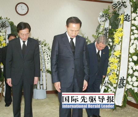 5月22日下午,一身深色西裝的李明博,臉色凝重,出現(xiàn)在中國駐韓國大使館設(shè)立的“5•12四川地震遇難者”吊唁堂內(nèi)。鞠躬默哀,敬獻(xiàn)花圈之后,李明博在吊唁簿上留言表示要與中國“共擔(dān)悲痛”,并強(qiáng)調(diào),“韓國將不遺余力地協(xié)助中國政府抗震救災(zāi)”。