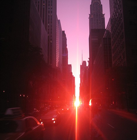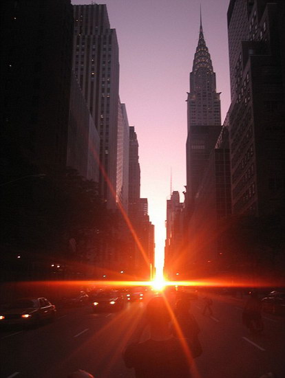 據(jù)悉,每年有兩天落日會(huì)對(duì)齊紐約曼哈頓主要的東西向街道,城市中高建筑會(huì)擋住落日,使曼哈頓看起來像是現(xiàn)代的巨石陣,整個(gè)紐約不夜城都沐浴在陽(yáng)光下。