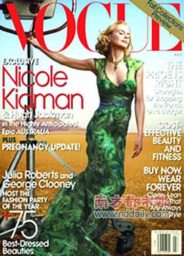 妮可·基曼(NicoleKidman)帶著她的新作《澳大利亞》(Australia)登上了今年7月號(hào)的《Vogue》雜志(見上圖),整整16頁(yè)的照片專版讓人驚艷地摒住呼吸。不用懷疑,這又是攝影大師安妮·萊博維茨(AnnieLeibovitz)的作品,電影般的華麗畫面、油畫般的細(xì)膩精致全部集中在她最新出爐的這組照片中。