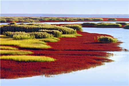 盤錦,地勢平坦,景觀獨(dú)特,資源豐富,可謂物華天寶,被稱作美麗、富饒的遼河金三角。距北京600多公里的遼寧盤錦有一片海灘,秋天一到,海邊的植物慢慢變紅,大片紅色鋪滿整個(gè)海灘,異常壯觀。