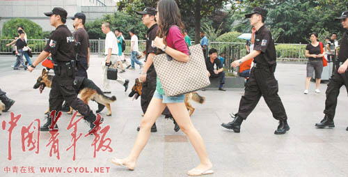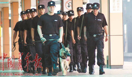 奧運會即將舉辦,突發(fā)事件隨時可能發(fā)生。為此,上海鐵路警方調(diào)集鐵警精銳進(jìn)駐上海站,并成立了鐵路上海站奧運安保前線指揮部。7月以來,鐵路特警全副武裝攜警犬在上海站、車站廣場及與地方接合部晝夜進(jìn)行巡邏檢查。
