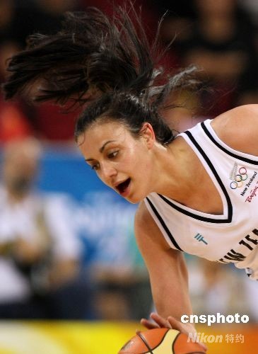 8月13日下午,中國(guó)女籃在北京奧運(yùn)會(huì)籃球小組賽第三輪的關(guān)鍵比賽中以80比63戰(zhàn)勝新西蘭隊(duì),小組出線已成定局。新西蘭隊(duì)身高1.66米的后衛(wèi)安吉拉-瑪莉諾雖然身高最矮,但一頭烏發(fā)卻讓所有的女籃姑娘望塵莫及,當(dāng)她運(yùn)球奔跑時(shí),長(zhǎng)發(fā)飄飄獨(dú)具一格。中新社發(fā) 任晨鳴 攝