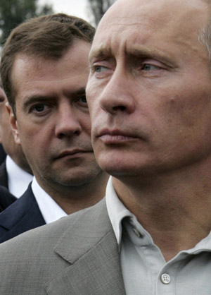 普京(前)直言決策權在梅德韋杰夫(后)手中。