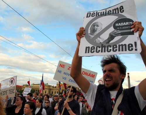 資料圖片:數(shù)千捷克民眾今年8月8日在布拉格舉行示威游行,抗議政府簽約同意美國在捷克建立反導雷達基地。這位示威者舉著的標語寫道:“謝謝,我們不要美國雷達!” (攝影:黃頻/中歐社)