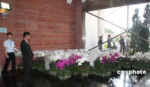 臺(tái)塑企業(yè)創(chuàng)辦人王永慶的遺體十七日由長(zhǎng)榮班機(jī)運(yùn)抵臺(tái)灣,靈堂設(shè)在桃園縣的長(zhǎng)庚大學(xué)活動(dòng)中心。圖為大批潔白的蝴蝶蘭鮮花運(yùn)抵靈堂。從十八日上午開(kāi)始,靈堂開(kāi)放各界吊唁。中新社發(fā) 耿軍 攝