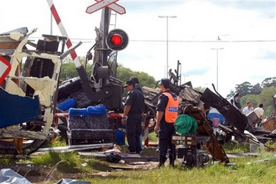 目擊者說,那輛巴士在凌晨?jī)牲c(diǎn)多行經(jīng)平交道的時(shí)候,不顧警告訊號(hào)和已經(jīng)放下的柵欄企圖硬闖,結(jié)果被火車撞成兩截,殘骸躺在鐵軌邊,行李箱、衣服和脫落扭曲的巴士座椅散落在鐵軌邊,火車也部份出軌。