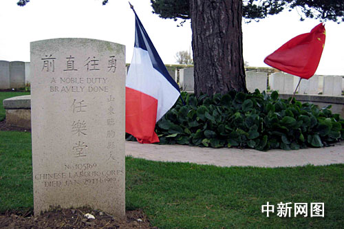 據(jù)了解,第一次世界大戰(zhàn)期間,約十四萬中國勞工遠渡重洋來到歐洲前線。他們主要集中在法國北部從事戰(zhàn)地后勤的工作,如維修道路、營房,挖掘戰(zhàn)壕,裝卸彈藥,救護傷員,掩埋尸體等。一九一七年八月,中國政府正式對德宣戰(zhàn)后,部分華工加入法軍,直接參加戰(zhàn)斗。一九一八年九月至十一月,德國等同盟國先后戰(zhàn)敗投降,華工為中國爭得戰(zhàn)勝國地位立下汗馬功勞,但同時也付出了沉重代價:中國勞工中有兩萬人再也沒能踏上故鄉(xiāng)的土地,這些客死他鄉(xiāng)的中國勞工大部分安葬在法國北部諾萊特等墓園中,每個人的墓碑上都刻有中文的銘文。