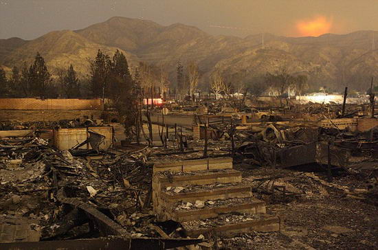 大火是上周四晚上在人口密集的圣費(fèi)爾南多山谷燃起的,摧毀了數(shù)十間房屋,并對(duì)關(guān)鍵的電力供應(yīng)線路構(gòu)成了威脅。大火在風(fēng)力的幫助下燒過(guò)干燥的山谷和山坡,熱風(fēng)使當(dāng)?shù)販囟冗_(dá)到創(chuàng)記錄的30度。火勢(shì)在時(shí)速達(dá)112公里的強(qiáng)風(fēng)的幫助下蔓延了2600英畝,迫使1萬(wàn)名居民撤離,自上周四以來(lái),過(guò)火面積已超過(guò)20000英畝,發(fā)生火情的地區(qū)包括洛杉磯北部的山丘、東南部的奧蘭治縣山谷、北部圣巴巴拉縣附近名人聚集的蒙特其托居住區(qū)。估計(jì)有1000套房屋被燒毀。加州州長(zhǎng)施瓦辛格在視察火災(zāi)造成的損失情況后稱:“對(duì)于南加州人來(lái)說(shuō),過(guò)去的幾天非常艱難!