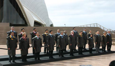 2007年悉尼APEC峰會的各領(lǐng)袖會穿什么“民族服裝”,主辦方一直保持高度神秘。直到各領(lǐng)袖在世界媒體前亮相之時才揭曉:原來澳洲選擇了深褐色的皮夾克,樣子很容易使人聯(lián)想到厚重的雨衣。