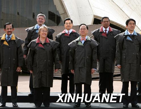 2007年9月8日,亞太經(jīng)濟合作組織第十五次領導人非正式會議第一階段會議開始前,各成員領導人身著澳大利亞特色服裝在悉尼歌劇院合影。新華社記者黃敬文攝