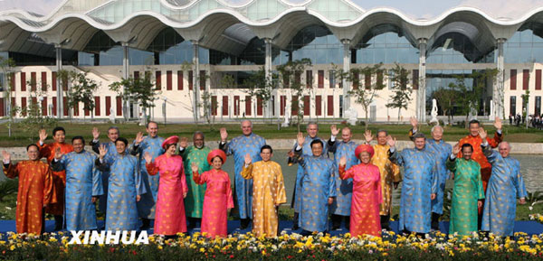 2006年11月19日,亞太經(jīng)合組織各成員領導人身穿越式傳統(tǒng)服裝,集體在越南首都河內(nèi)國家會議中心西島合影留念。 新華社記者 樊如鈞 攝