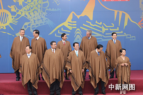 為期兩天的亞太經(jīng)合組織第十六次領(lǐng)導(dǎo)人非正式會議,二十三日在秘魯首都利馬結(jié)束。圖為各成員領(lǐng)導(dǎo)人在會后身著南美披風(fēng)合影。齊彬攝