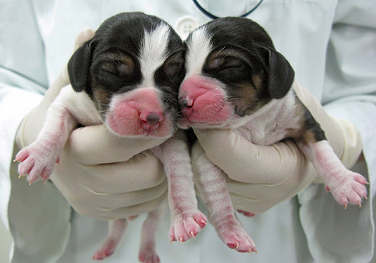 接著,研究組于11月10日把胚胎植入五只代孕犬體內(nèi),其中一只代孕犬產(chǎn)下了兩只犬仔,研究人員給它們?nèi)∶麨椤澳g(shù)”與“主干”。