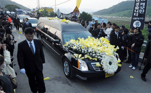 有關(guān)人員捧著牌位和無窮花大勛章出來,隨后盧武鉉前總統(tǒng)的棺柩經(jīng)過峰下村,運至黑色凱迪拉克,現(xiàn)場傳出哀戚嗚咽的哭聲。