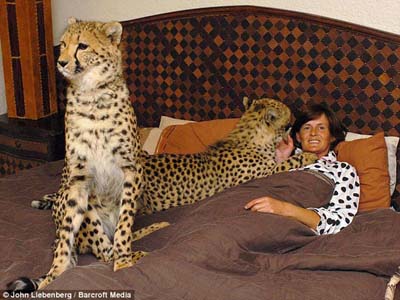 中新網(wǎng)7月3日電 據(jù)英國媒體報道,南非一名46歲女子在家中養(yǎng)了4只印度豹、5只獅子和2只老虎,她與它們同吃同住親密無間,甚至晚上睡覺時也同這些伙伴躺在一張床上。