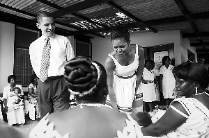 很多加納人對(duì)奧巴馬這位有著非洲血統(tǒng)的美國總統(tǒng)的到來持歡迎態(tài)度。這幾天,加納首都的主要街道被奧巴馬和米爾斯的畫像裝點(diǎn)得“非常熱鬧”。奧巴馬一家的大幅海報(bào)成為街頭小販兜售的“暢銷貨”。