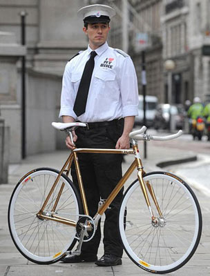 這輛自行車受英國環(huán)境運(yùn)輸協(xié)會委托定制而成,鏈條、座位、車把手都和普通自行車的一樣,不過表面卻鍍上了24克拉的黃金。由于在英國,售價超過4000英鎊的自行車都不能享受保險“待遇”,因此購買這輛自行車的人還必須雇一位“保鏢”,在公共場合負(fù)責(zé)看管。